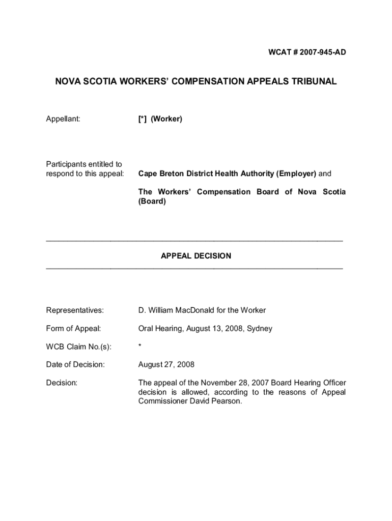 Get the free Workers' Compensation Appeal Tribunal (WCAT) - wcat novascotia