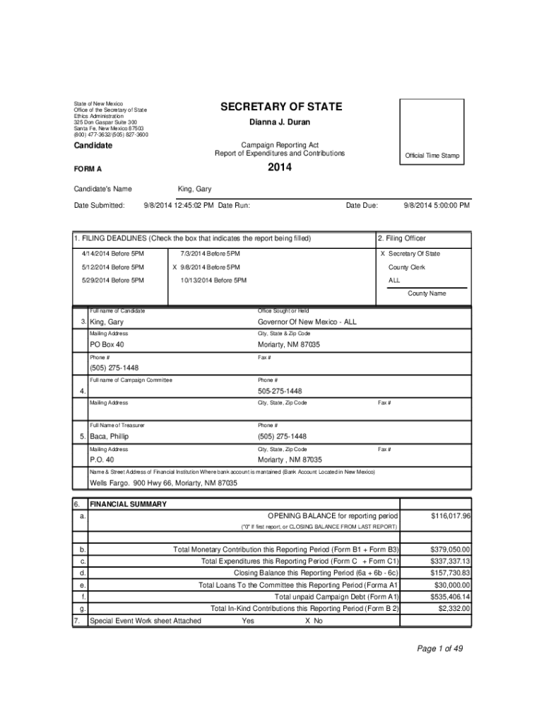 State of New Mexico Office of the Secretary of State Ethics Administration 325 Don Gaspar Suite 300 Santa Fe, New Mexico 87503 (800) 4773632/(505) 8273600SECRETARY OF STATE Dianna J. Duran Campaign
