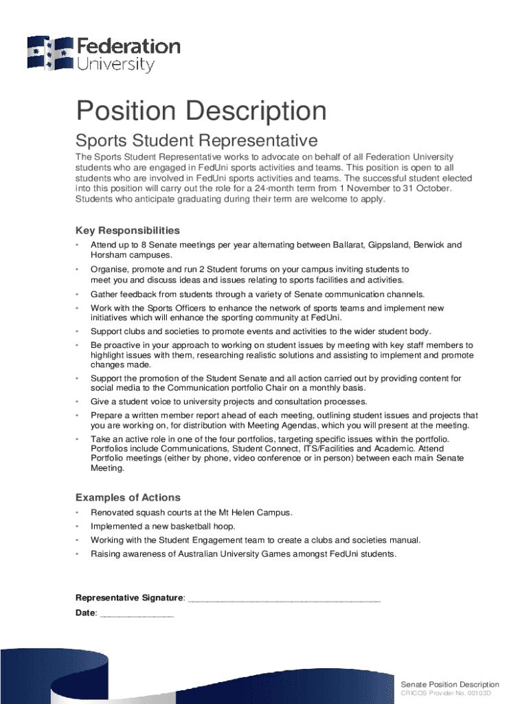 Position Description Sports Student Representative The Sports Student Representative works to advocate on behalf of all Federation University students who are engaged in Fecund sports activities and