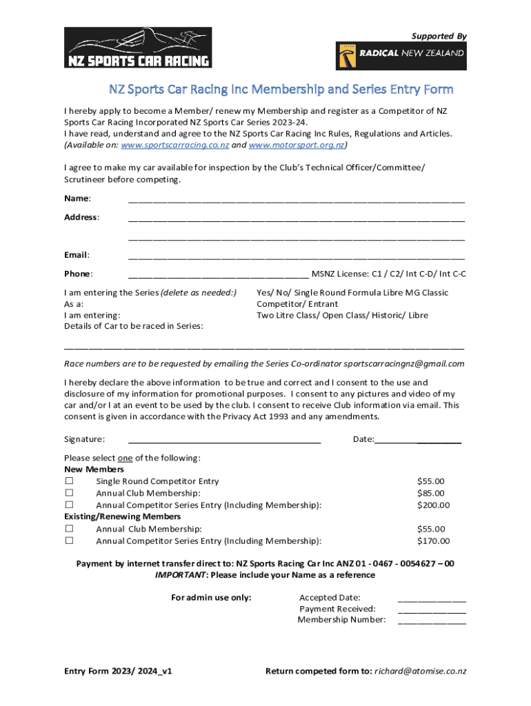 Get the free NZ Sports Car Racing Inc Membership and Series Entry Form