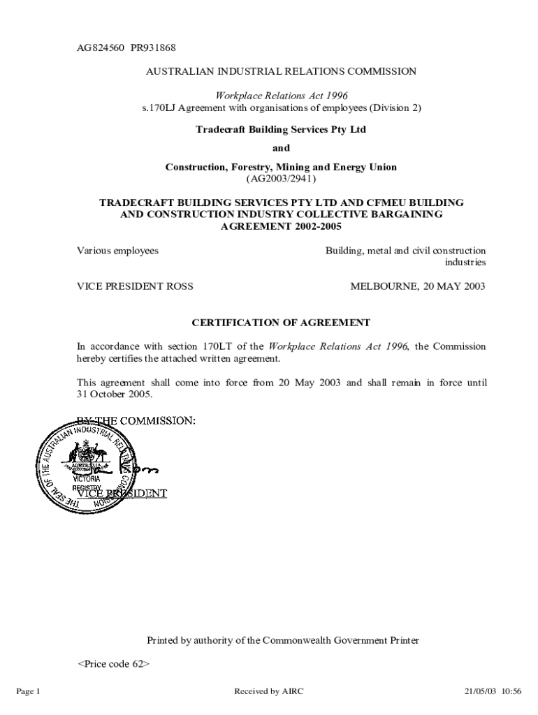 Get the free workplace relations act 1996 union collective agreement