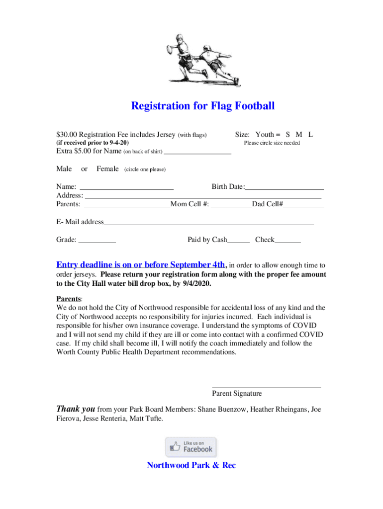 Registration for Flag Football $30.00 Registration Fee includes Jersey (with flags)Size: Youth S M L(if received prior to 9420)Please circle size neededExtra $5.00 for Name (on back of shirt) ___