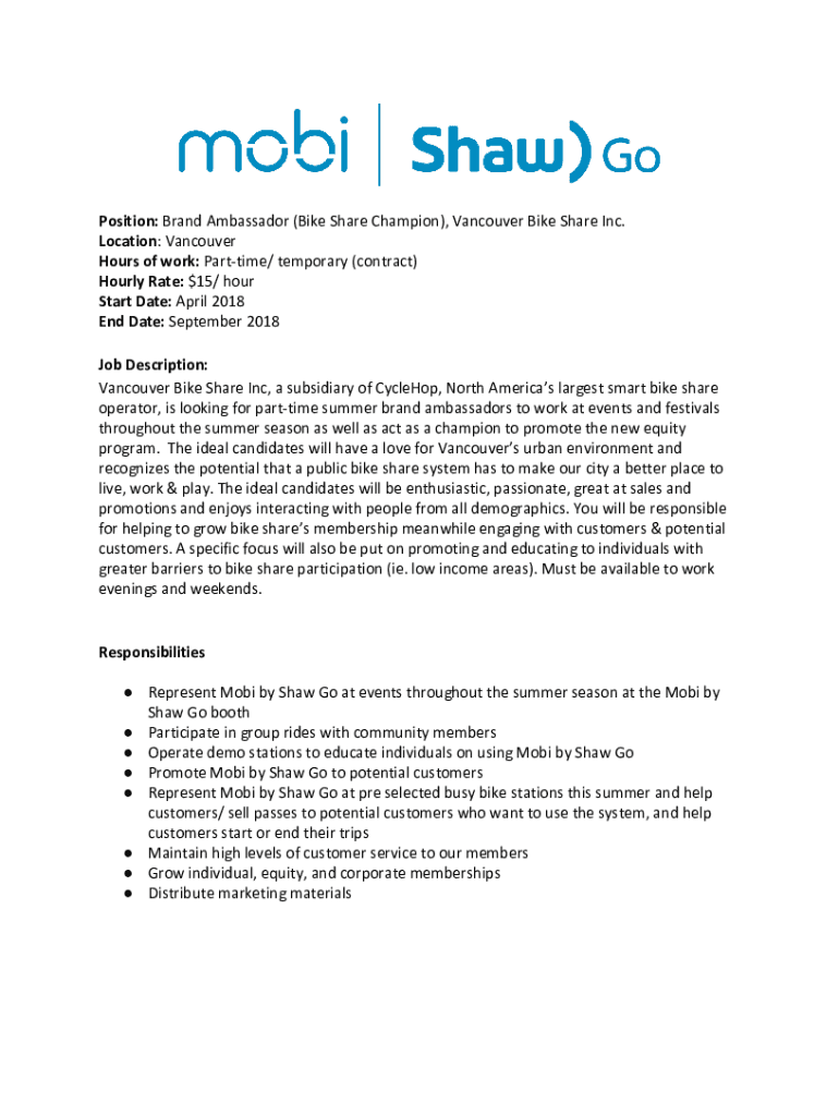 Position: Brand Ambassador (Bike Share Champion), Vancouver Bike Share Inc. Location: Vancouver Hours of work: Part time/ temporary (contract) Hourly Rate: $15/ hour Start Date: April 2018 End Date:
