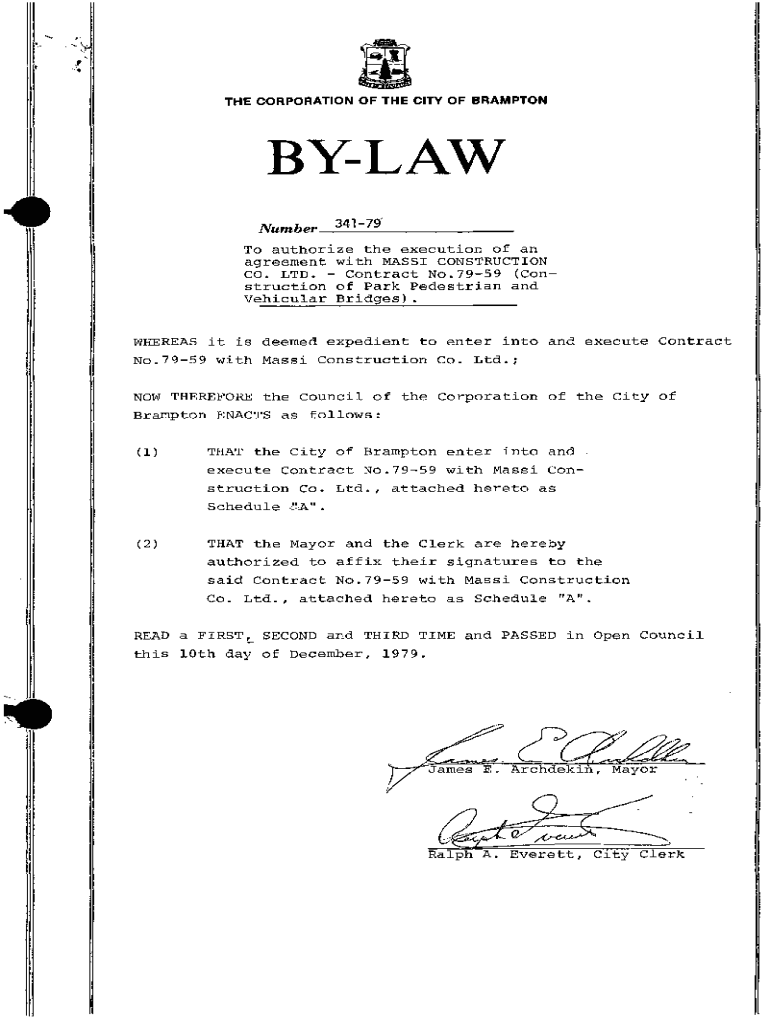 THE CORPORATION OF THE CITY OF BRAMPTONBYLAW Number_3_4_1__79_\' _ _ _ _ _ _ To authorize the execution of an agreement with MASS CONSTRUCTION CO. LTD. Contract No.7959 (Construction of Park Pedestrian