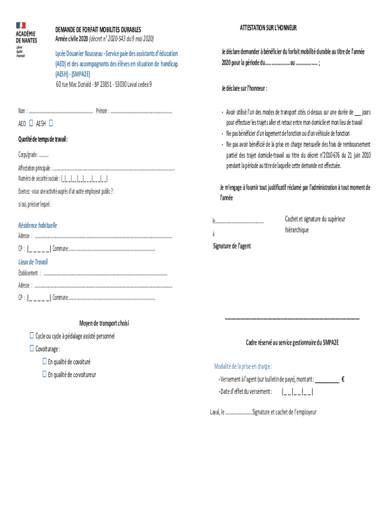 ATTESTATION SUR LHONNEURDEMANDE DE FORFEIT MOBILIZES DURABLES Anne civil 2020 (crew n 2020543 Du 9 Mai 2020) Lace Doughier Rousseau Service page DES assistants education (AED) et DES accompanists
