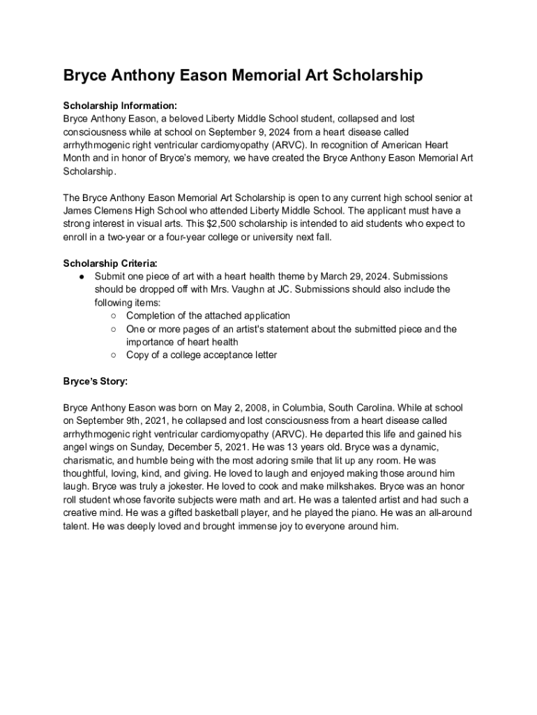 Bryce Anthony Season Memorial Art Scholarship Information: Bryce Anthony Season, a beloved Liberty Middle School student, collapsed and lost consciousness while at school on September 9, 2024 from