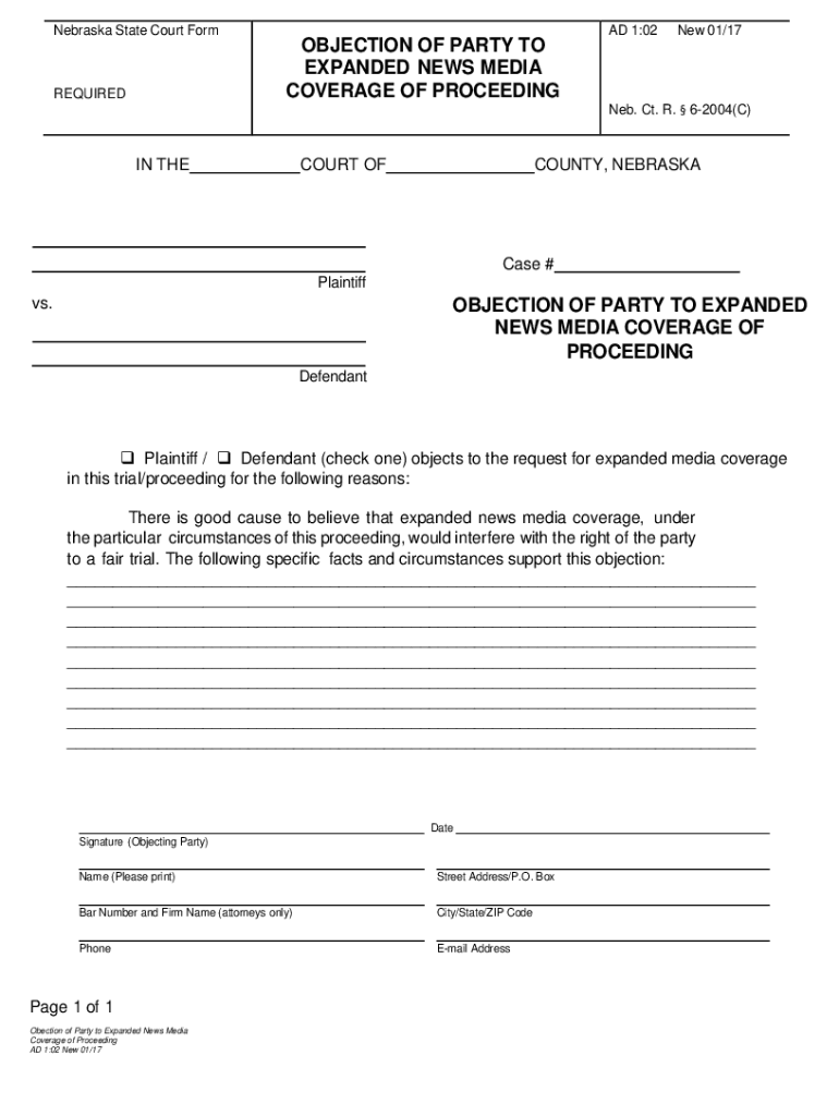 Nebraska State Court FormREQUIREDOBJECTION OF PARTY TO EXPANDED NEWS MEDIA COVERAGE OF PROCEEDING IN COURT FAD 1:02New 01/17Neb. Ct. R. 62004(C)COUNTY, Nebraskans # Plaintiffs. OBJECTION OF PARTY