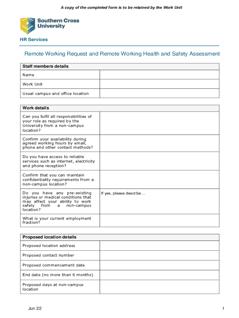 A copy of the completed form is to be retained by the Work Unit HR ServicesRemote Working Request and Remote Working Health and Safety Assessment Staff members details Name Work Unit Usual campus