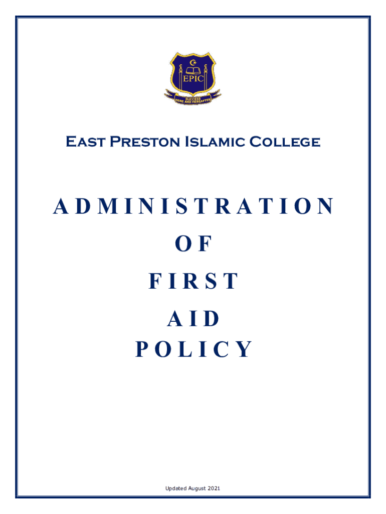 East Preston Islamic CollegeADMINISTRATION OF FIRST AID POLICYUpdated August 2021Purpose This policy will provide guidelines for the administration of first aid at the East Preston Islamic College