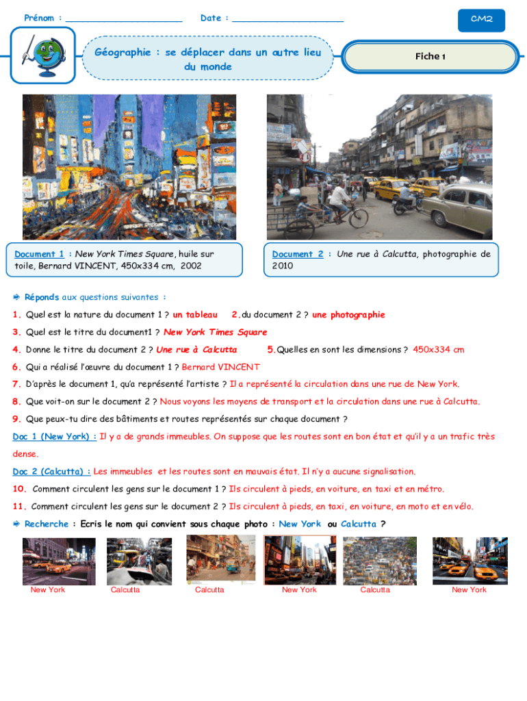 Prom : ___Date : ___CM2Gographie : SE placer days un outre lieu Du mondeDocument 1 : New York Times Square, Hooke SUR tile, Bernard VINCENT, 450×334 cm, 2002Fiche 1Document 2 : One rue Calcutta,