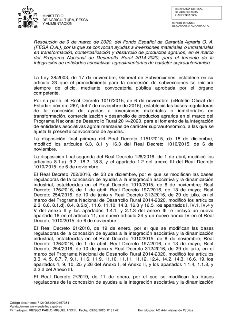 MINISTER DE AGRICULTURAL, PESC Y ALIMENTACINSECRETARA GENERAL DE AGRICULTURAL Y ALIMENTATION FOND ESP AOL DE GRANT AGRARIAN O. A. Resolucin de 9 de Mario de 2020, Del Fond Español de Garanta Agrarian