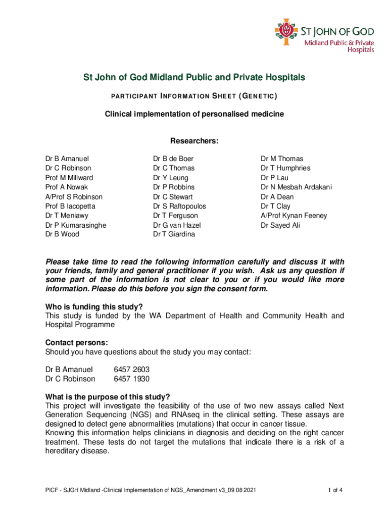 St John of God Midland Public and Private Hospitals PAR T I C I PAN T I N F OR M AT I ONS H E E T (G E N E T I C)Clinical implementation of personalized medicineResearchers: Dr B Manuel Dr C Robinson