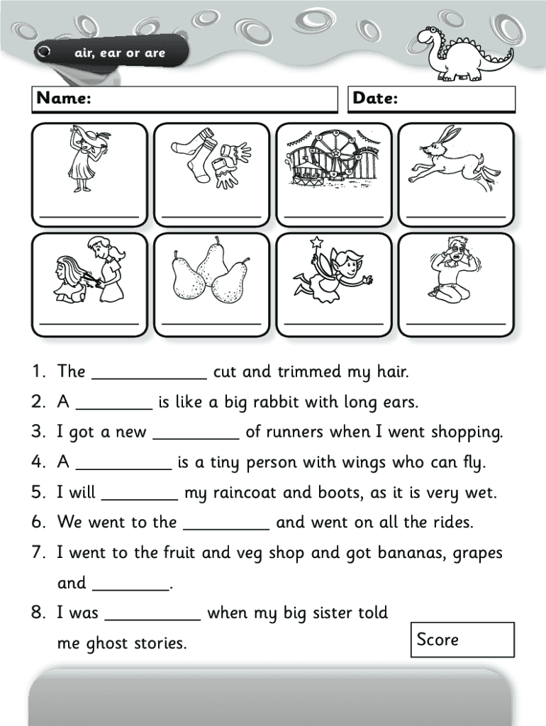 air, ear or areName:Date:1. The ___ cut and trimmed my hair. 2. A ___ is like a big rabbit with long ears. 3. I got a new ___ of runners when I went shopping. 4. A ___ is a tiny person with wings