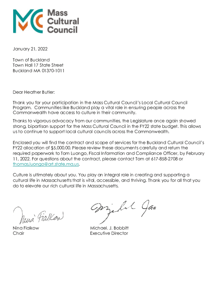January 21, 2022, Town of Auckland Town Hall 17 State Street Auckland MA 013701011Dear Heather Butler: Thank you for your participation in the Mass Cultural Councils Local Cultural Council Program.