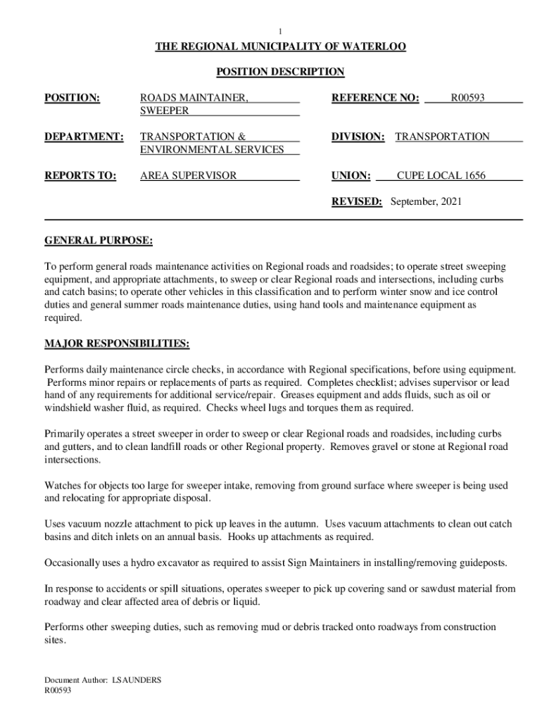 1THE REGIONAL MUNICIPALITY OF WATERLOO POSITION DESCRIPTION POSITION:ROADS MAINTAINER, SWEEPERREFERENCE NO:R00593DEPARTMENT:TRANSPORTATION & ENVIRONMENTAL SERVICESDIVISION: TRANSPORTATIONREPORTS TO:AREA