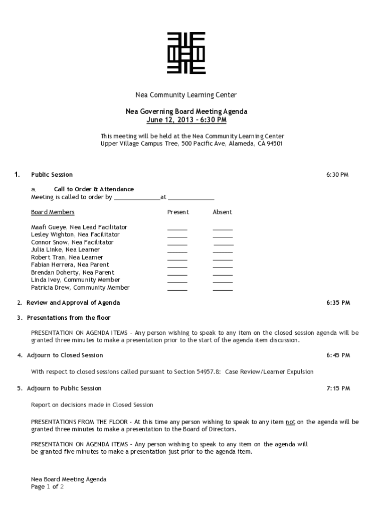 NEA Governing Board Meeting Agenda
