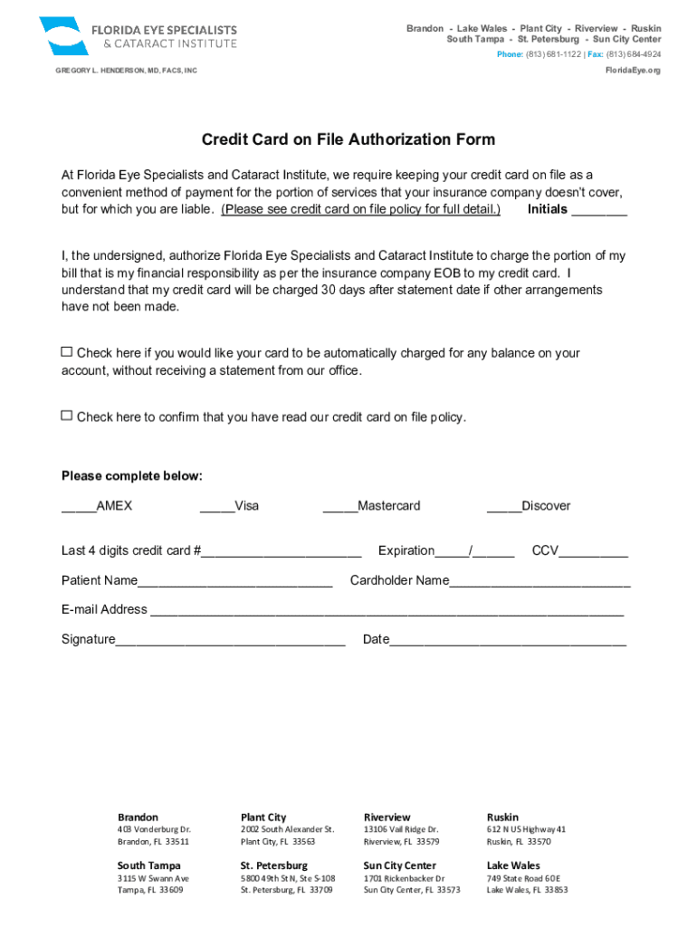 Brandon Lake Wales Plant City Riverview Ruskin South Tampa St. Petersburg Sun City Center Phone: (813) 6811122 | Fax: (813) 6844924 Florida.Gregory L. HENDERSON, MD, FACS, Accredit Card on File Authorization