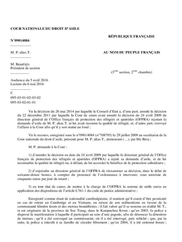 COUR NATIONALE DU DROIT DASILE RPUBLIQUE FRANAISE N09014084 ___ M. P. alias T. ___ M. Beaufas Prsident de section ___AU NOM DU PEUPLE FRANAIS(3me section, 2me chambre)Audience du 5 avril 2016 Lecture