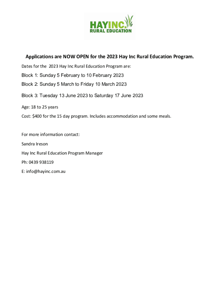 Applications are NOW OPEN for the 2023 Hay Inc Rural Education Program. Dates for the 2023 Hay Inc Rural Education Program are: Block 1: Sunday 5 February to 10 February 2023 Block 2: Sunday 5 March