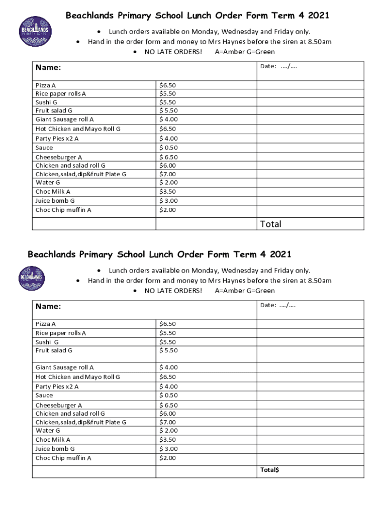 Beach lands Primary School Lunch Order Form Term 4 2021 Lunch orders available on Monday, Wednesday and Friday only. Hand in the order form and money to Mrs Haynes before the siren at 8.50am NO LATE