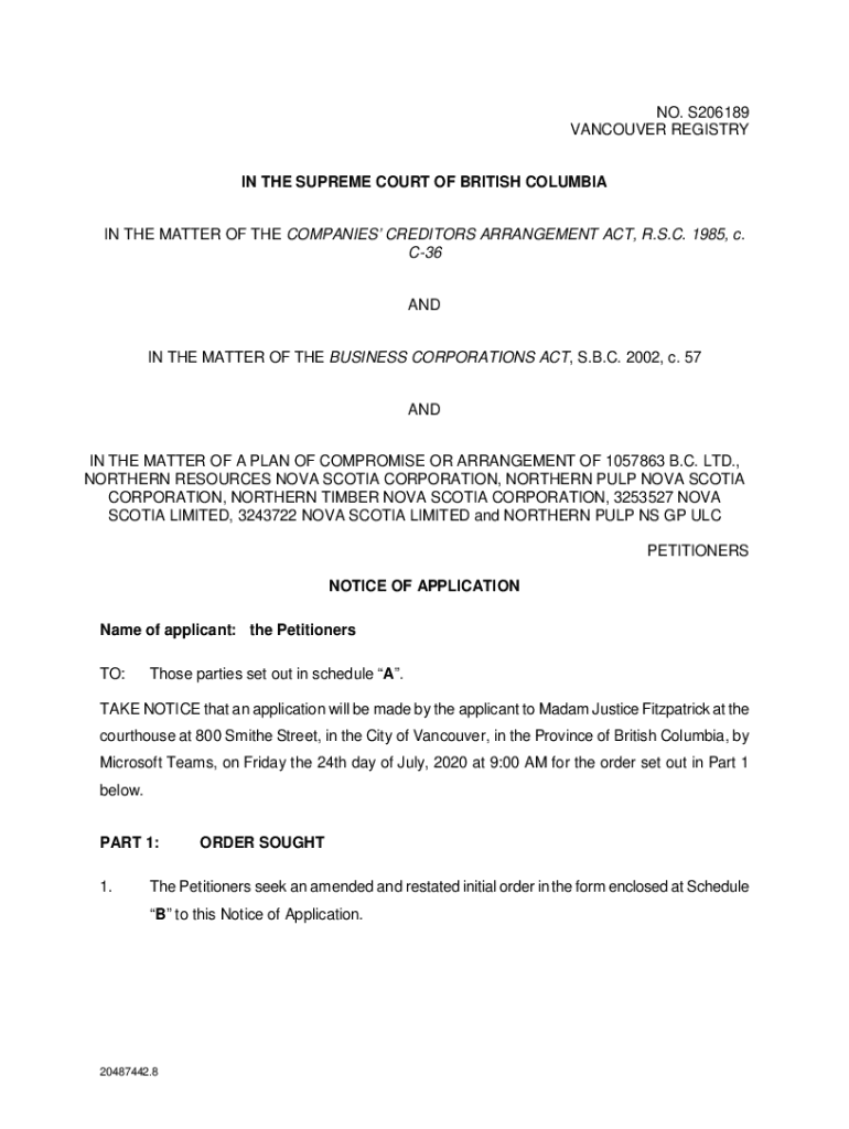 NO. S206189 VANCOUVER REGISTRY IN THE SUPREME COURT OF BRITISH COLUMBIA IN THE MATTER OF THE COMPANIES CREDITORS ARRANGEMENT ACT, R.S.C. 1985, c. C36 AND IN THE MATTER OF THE BUSINESS CORPORATIONS