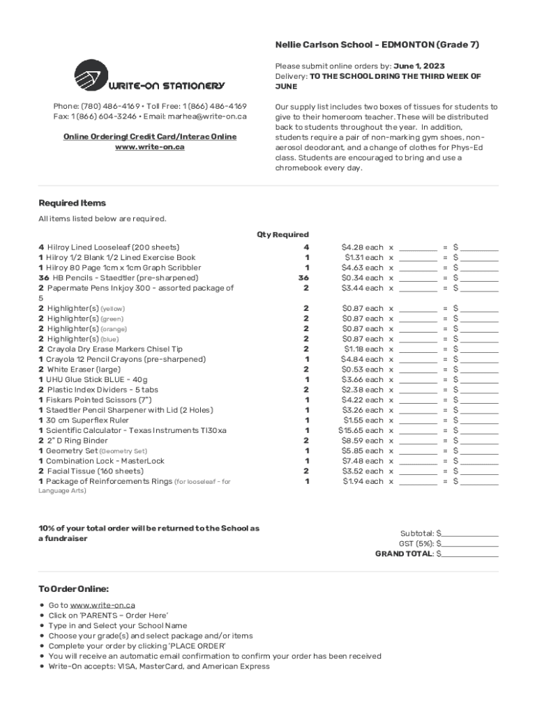 Nellie Carlson School EDMONTON (Grade 7) Please submit online orders by: June 1, 2023, Delivery: TO THE SCHOOL DURING THE THIRD WEEK OF JUNE Phone: (780) 4864169 Toll Free: 1 (866) 4864169 Fax: 1