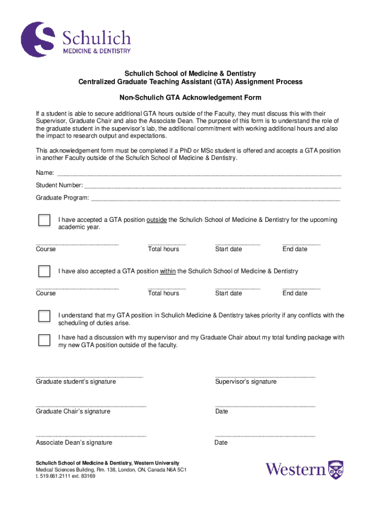 Church School of Medicine & Dentistry Centralized Graduate Teaching Assistant (GTA) Assignment Process NonSchulich GTA Acknowledgement Form If a student is able to secure additional GTA hours outside