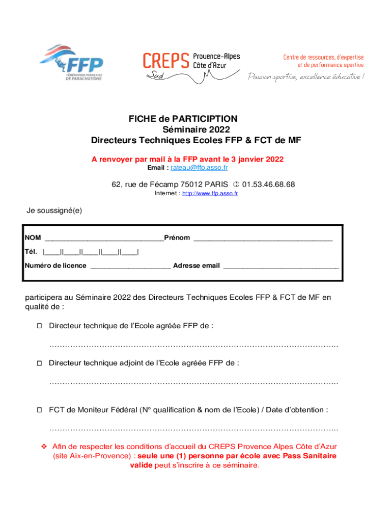 FICHE de PARTICIPTION Minaret 2022 Directors Techniques Ecol es FFP & ACT de MF A enjoyed par mail la FFP savant LE 3 Janvier 2022 Email : rateau@ffp.asso.fr62, rue de Camp 75012 PARIS 01.53.46.68.68