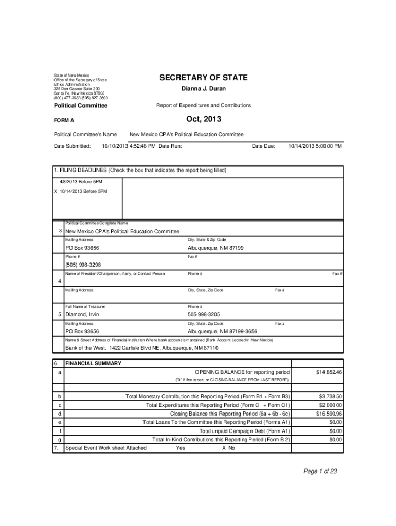 State of New Mexico Office of the Secretary of State Ethics Administration 325 Don Gaspar Suite 300 Santa Fe, New Mexico 87503 (800) 4773632/(505) 8273600SECRETARY OF STATEPolitical CommitteeReport