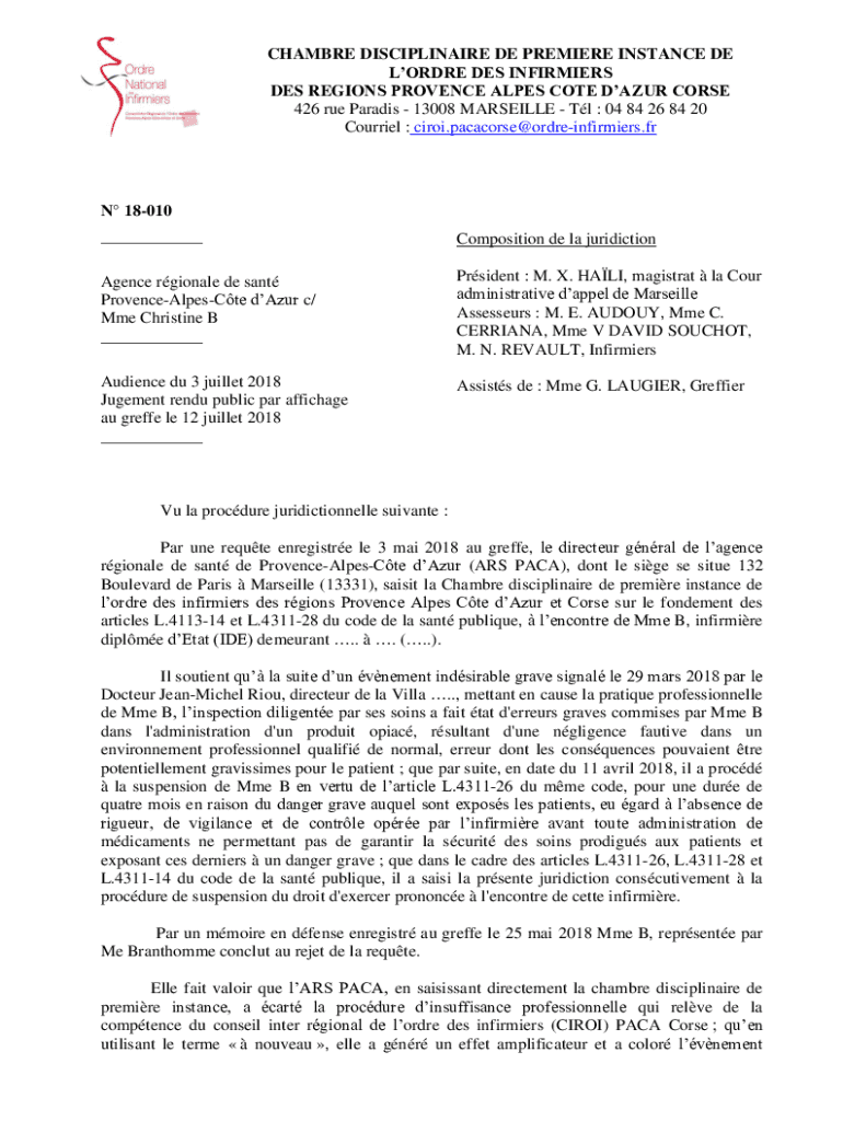 CHAM BRE DISCIPLINARY DE PREMIERE INSTANCE DE LORRE DES INFIRM IERS DES REGIONS PROVENCE ALPS Côte d'Azur COURSE 426 rue Paradise 13008 MARSEILLE Tl : 04 84 26 84 20 Courier : ciroi.pacacorse@ordreinfirmiers.frN