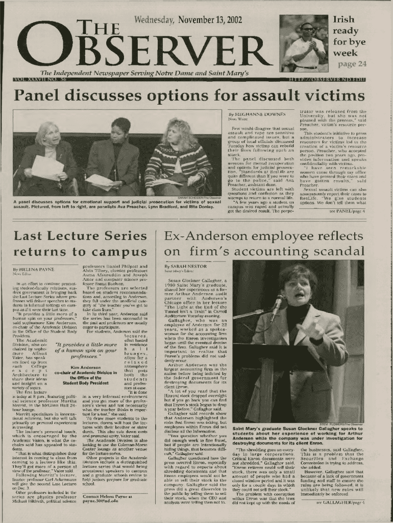 Hi/ not Irish ready for bye weekyvmncbudy, November 13,2002h eserver77ie Independent New paper Serving Note Dam e and Saint Mary\'panel discusses options for assault victims By M E G H A N N E DOW