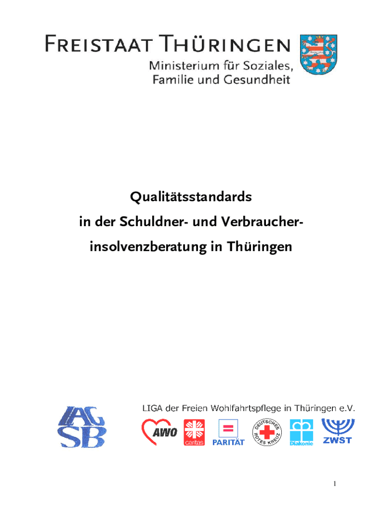 Qualittsstandards in her Shoulder UND Verbraucherinsolvenzberatung in Thringen1Inhaltsverzeichnis Einfhrung4I. Strukturqualitt51. Beratungsangebot52. Trgerschaft53. Konzeption54. Personally Situation