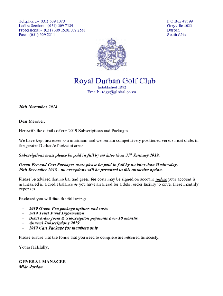 Telephone: 031) 309 1373 Ladies Section: (031) 309 7189 Professional: (031) 309 1530/309 2581 Fax: (031) 309 2211P O Box 47599 Granville 4023 Durban South Africa Royal Durban Golf Club Established