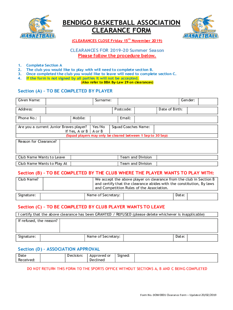 BENDIGO BASKETBALL ASSOCIATION CLEARANCE FORM (CLEARANCES CLOSE Friday 15th November 2019)CLEARANCES FOR 201920 Summer Season Please follow the procedure below. 1. 2. 3. 4. Complete Section A The