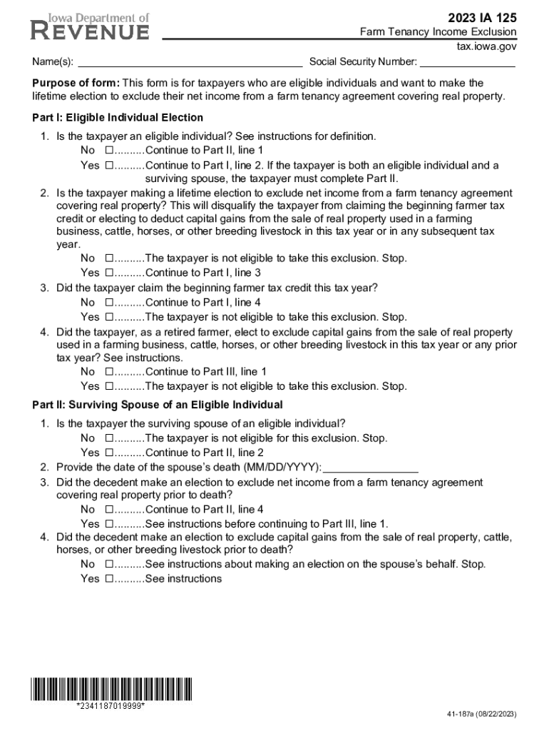 2023 IA 125Farm Tenancy Income Exclusion tax.Iowa.gov Name(s): ___ Social Security Number: ___ Purpose of form: This form is for taxpayers who are eligible individuals and want to make the lifetime