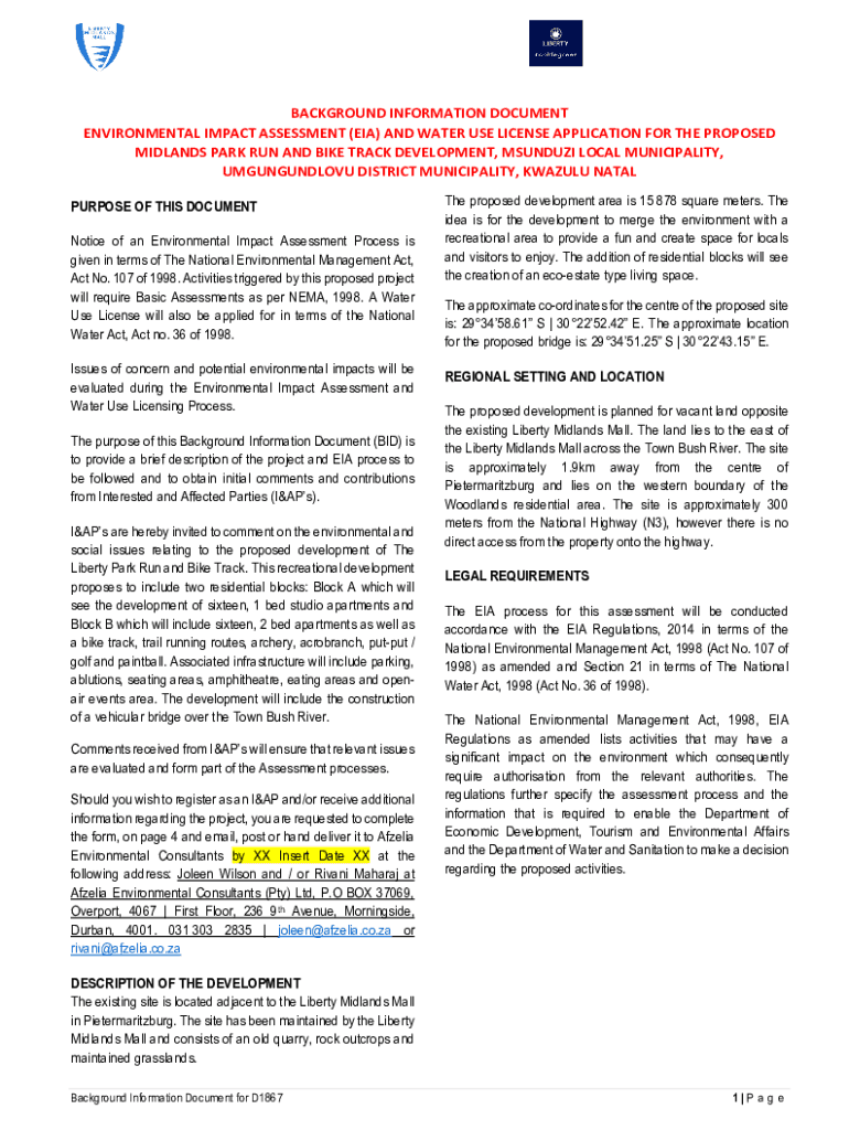 BACKGROUND INFORMATION DOCUMENT ENVIRONMENTAL IMPACT ASSESSMENT (EIA) AND WATER USE LICENSE APPLICATION FOR THE PROPOSED MIDLANDS PARK RUN AND BIKE TRACK DEVELOPMENT, KUNDUZ LOCAL MUNICIPALITY, UMGUNGUNDLOVU