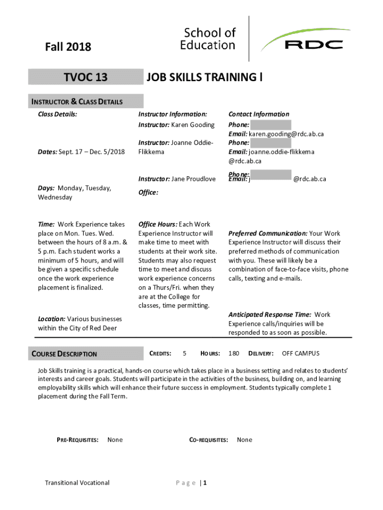Fall 2018 TVOC 13JOB SKILLS TRAINING lINSTRUCTOR & CLASS DETAILS Class Details:Instructor Information: Instructor: Karen GoodingDates: Sept. 17 Dec. 5/2018Days: Monday, Tuesday, Wednesday Time: Work