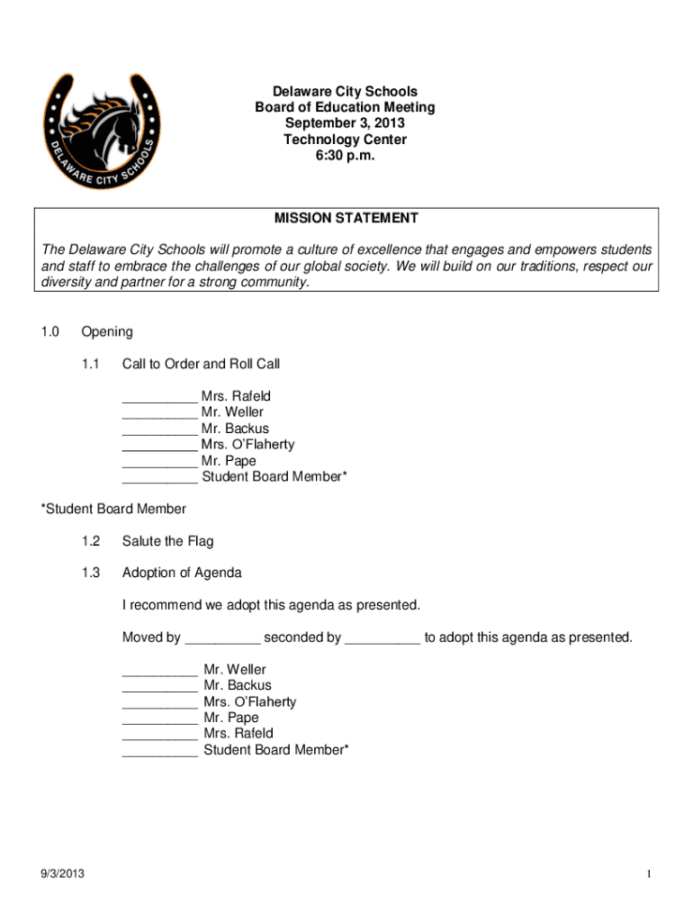 Delaware City Schools Board of Education Meeting September 3, 2013, Technology Center 6:30 p.m.MISSION STATEMENT The Delaware City Schools will promote a culture of excellence that engages and empowers