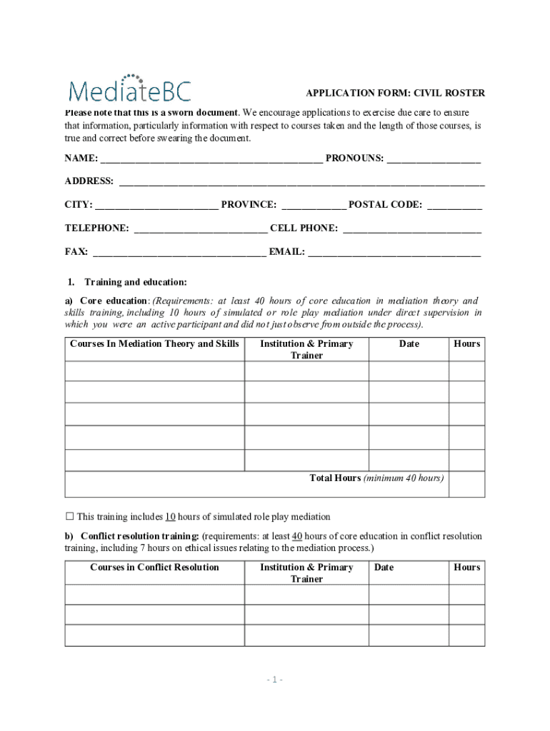 APPLICATION FORM: CIVIL ROSTER Please note that this is a sworn document. We encourage applications to exercise due care to ensure that information, particularly information with respect to courses