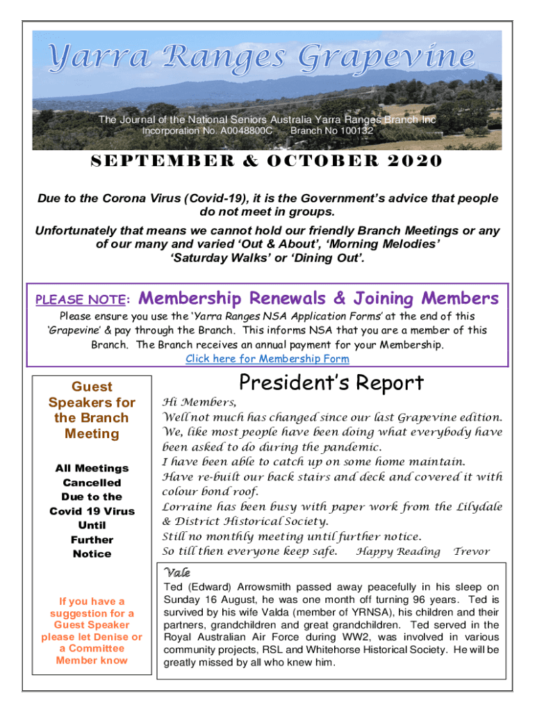 The Journal of the National Seniors Australia Area Ranges Branch Inc Incorporation No. A0048800CBranch No 100132SEPTEMBER & OCTOBER 2020 Due to the Coronavirus (COVID-19), it is the Governments' advice