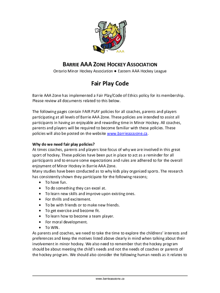 BARRIE AAA ZONE HOCKEY ASSOCIATION Ontario Minor Hockey Association Eastern AAA Hockey LeagueFair Play Code Barrie AAA Zone has implemented a Fair Play/Code of Ethics policy for its membership. Please