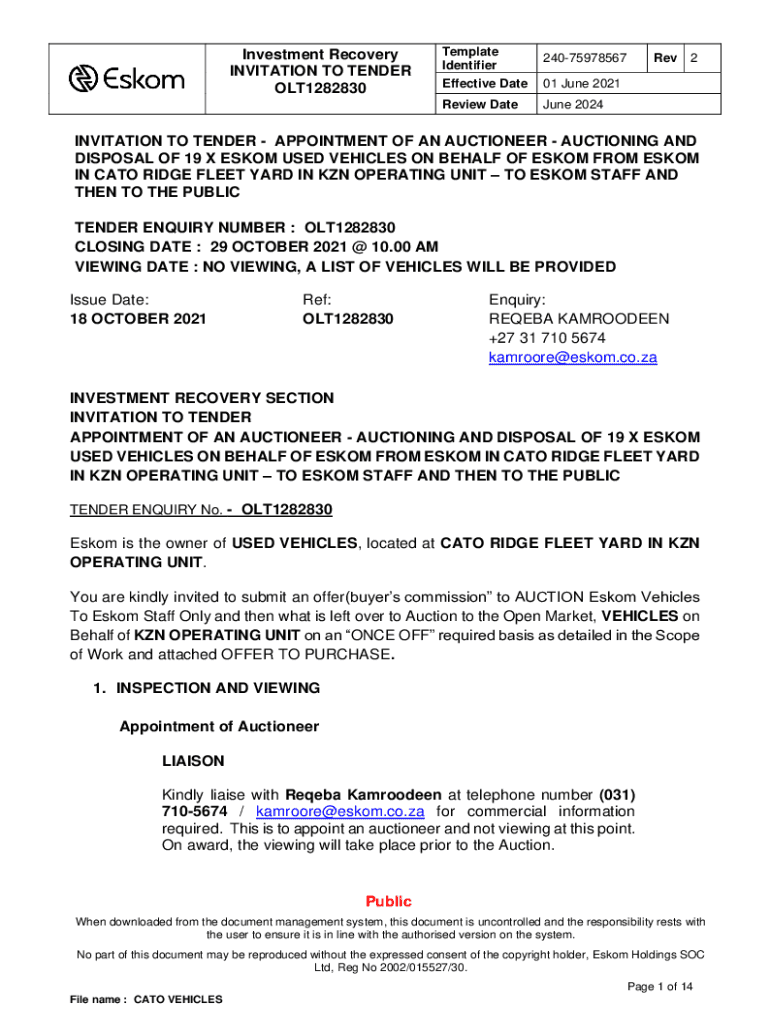 Investment Recovery INVITATION TO TENDER OLT1282830Template Identifier Effective Date Review Date24075978567Rev201 June 2021 June 2024INVITATION TO TENDER APPOINTMENT OF AN AUCTIONEER AUCTIONING AND