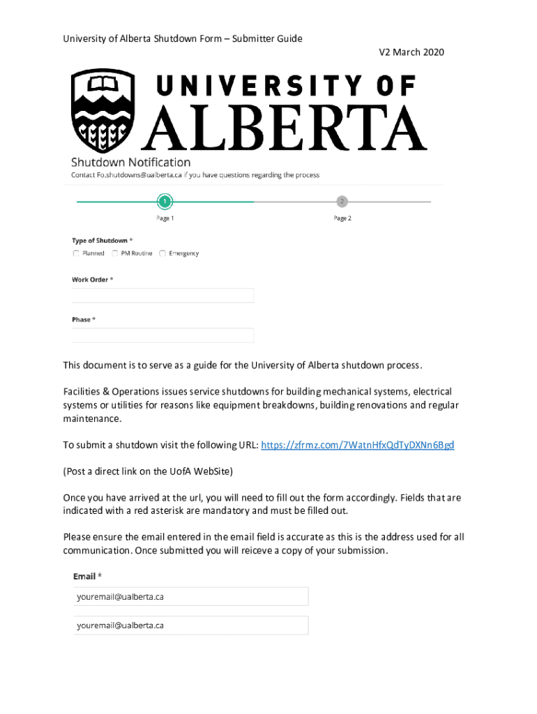 University of Alberta Shutdown Form Submitter GuideV2 March 2020This document is to serve as a guide for the University of Alberta shutdown process. Facilities & Operations issues service shutdowns