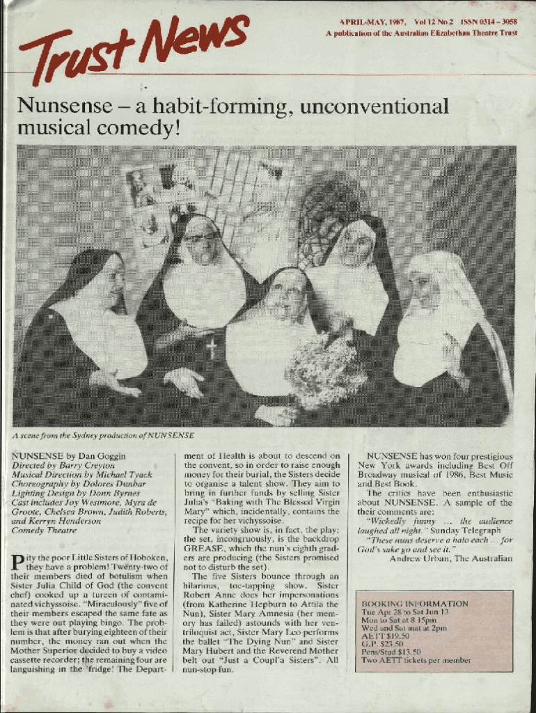 APRIL, 1987, VoI12No2 ISSN03143058 A publication of the Australian Elizabethan Theater TrustNunsense a habit forming, unconventional musical comedy! A scene from the Sydney production of NUNSENSENUNSENSE