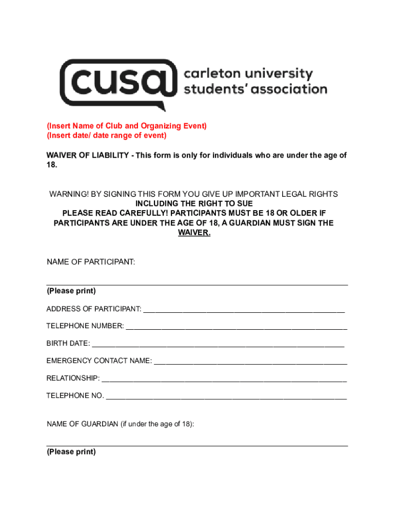 (Insert Name of Club and Organizing Event) (Insert date/ date range of event) WAIVER OF LIABILITY This form is only for individuals who are under the age of 18.WARNING! BY SIGNING THIS FORM YOU GIVE