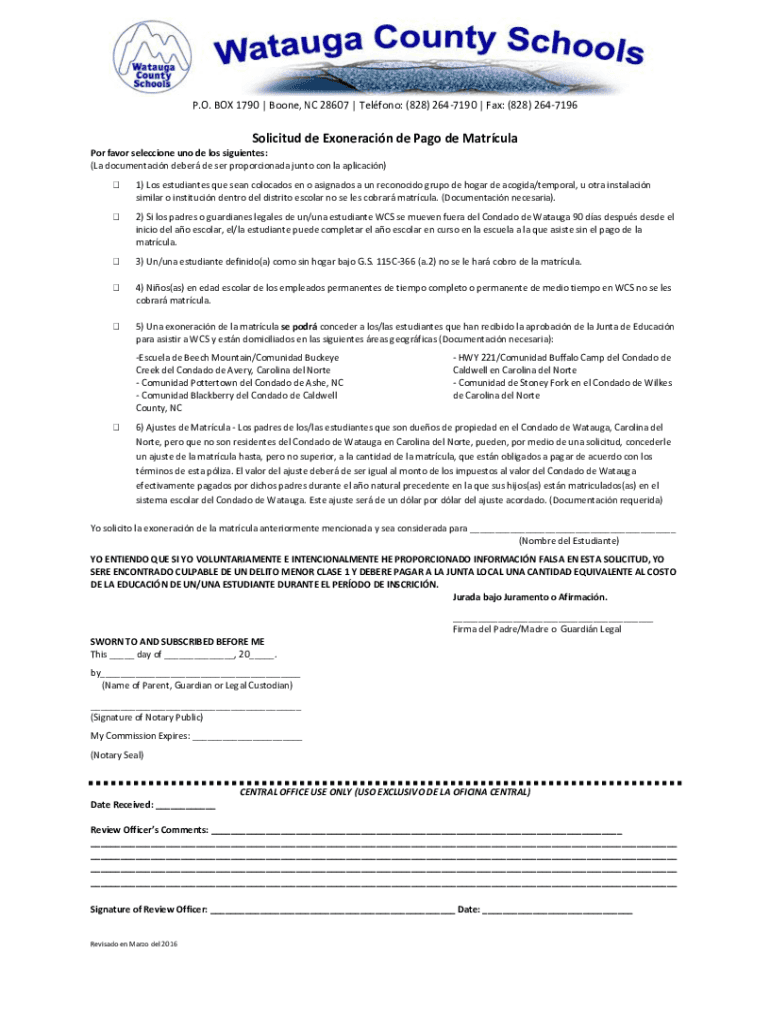 P.O. BOX 1790 | Boone, NC 28607 | Teflon: (828) 2647190 | Fax: (828) 2647196Solicitud de Exonerating de Pago de Matrcula