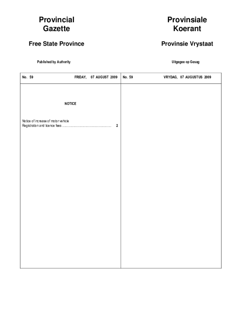 Provincial GazetteProvinsiale KoerantFree State ProvinceProvinsie VrystaatPublished by Authority No. 59Uitgegee op GesagFRIDAY,07 AUGUST 2009NOTICENotice of increase of motor vehicle Registration