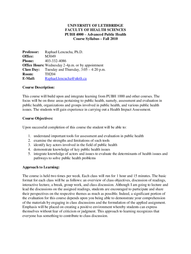 UNIVERSITY OF LETHBRIDGE FACULTY OF HEALTH SCIENCES PUBH 4000 Advanced Public Health Course Syllabus Fall 2010Professor: Raphael Lencucha, Ph.D. Office: M3049 Phone: 4033324086 Office Hours: Wednesday