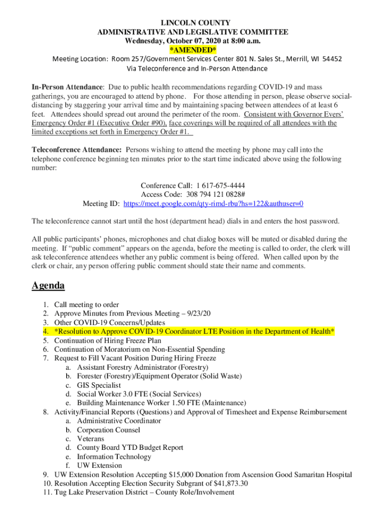 LINCOLN COUNTY ADMINISTRATIVE AND LEGISLATIVE COMMITTEE Wednesday, October 07, 2020, at 8:00 a.m. *AMENDED* Meeting Location: Room 257/Government Services Center 801 N. Sales St., Merrill, WI 54452