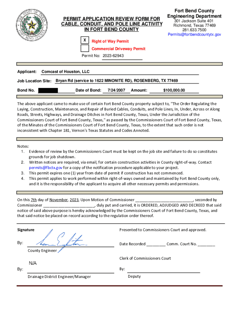 PERMIT APPLICATION REVIEW FORM FOR CABLE, CONDUIT, AND POLE LINE ACTIVITY IN FORT BEND COUNTY Fort Bend County Engineering Department 301 Jackson Suite 401 Richmond, Texas 77469 281.633.7500 Permits@fortbendcountytx.govRight